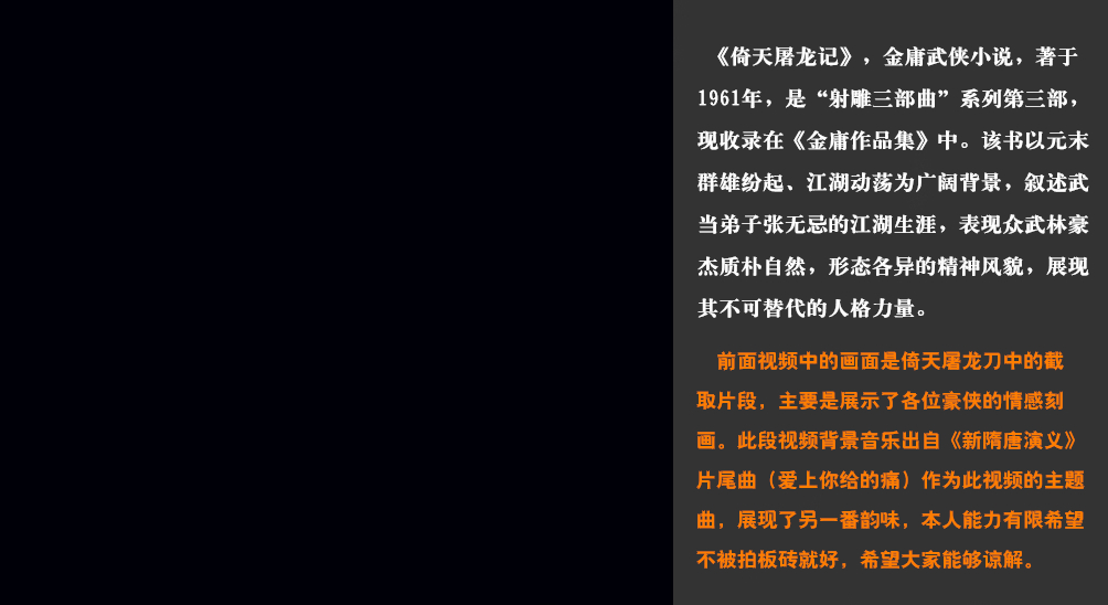 腾鳌天地网叙:《倚天屠龙记》是武侠大师金庸的长篇小说,1961年所著,是“射雕三部曲”系列第三部。故事时间前后跨度一百年,以元末群雄纷起、江湖动荡为广阔背景,剧情围绕两样兵器屠龙刀和倚天剑展开。第一卷叙述武当弟子张翠山卷入夺刀纷争,第二卷至第四卷叙述张翠山之子张无忌的江湖生涯,主要是明教和中原武林之争及起义军和朝廷的对抗,少年张无忌因缘际会练就一身盖世武功,以天下人叹服的武功和无可替代的人格力量统领群雄,故事同时展现武林众豪杰的质朴豪情和形态各异的精神风貌。